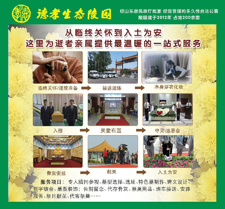 德孝生态陵园是菏泽唯一一家从临终关怀到入土为安的一站式殡葬礼仪服务陵园,服务项目有:临终关怀、接送遗体、净身穿衣化妆、布置灵堂、守灵服务、主持追思会、入殓火化、起灵入土或骨灰存放等项目。您只需拨打电话0530-2261555,德孝生态陵园专业的殡仪团队,将为您提供最暖心的一站式殡葬礼仪服务,让您和家人省去四处奔波的繁琐事宜。