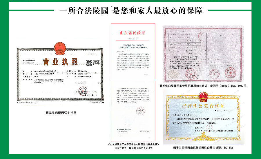 山东省民政厅关于德孝生态陵园正式营业批复的文件编号:鲁民涵(2014)264号,